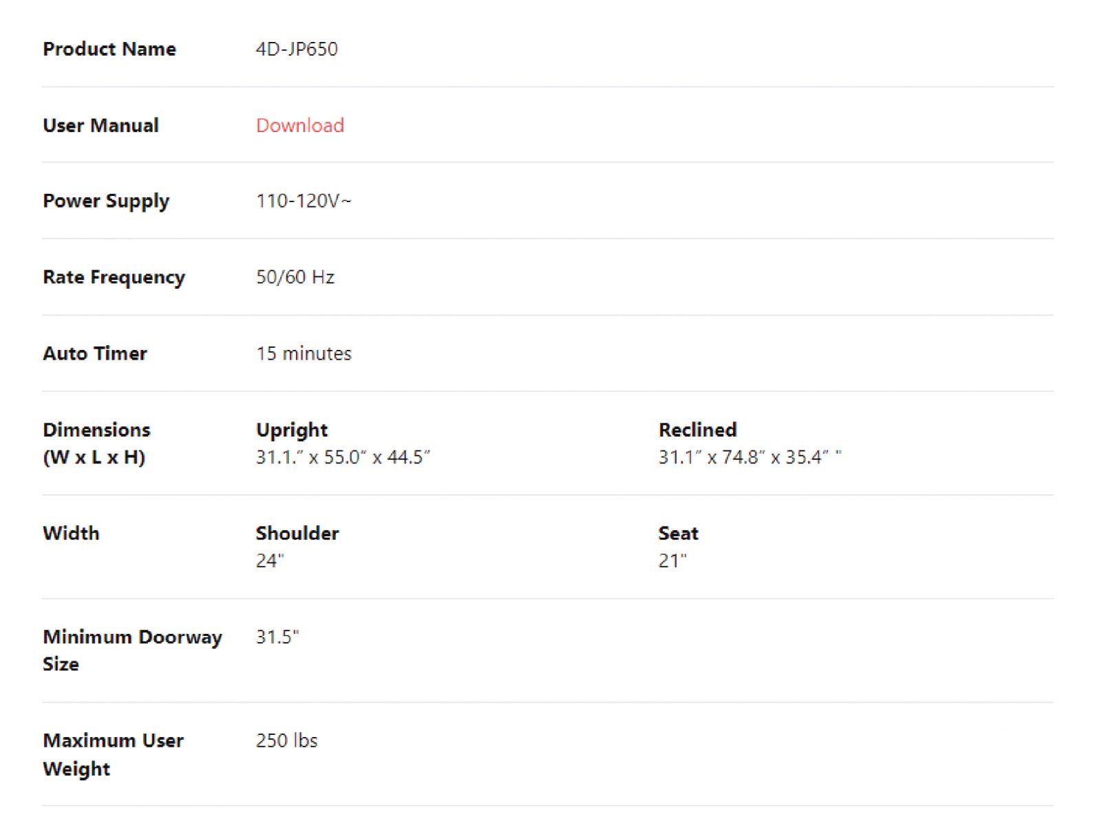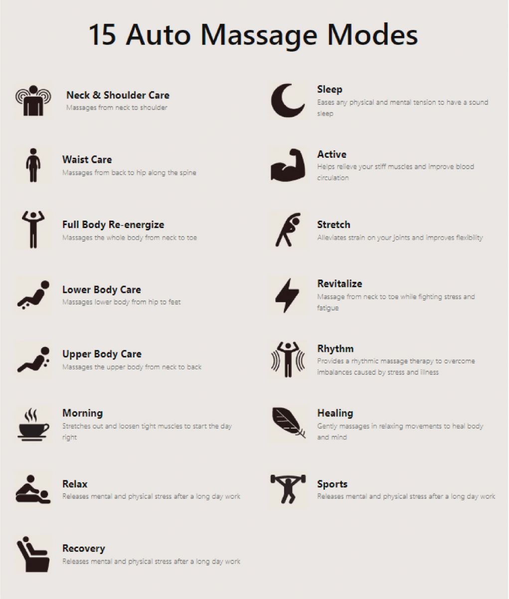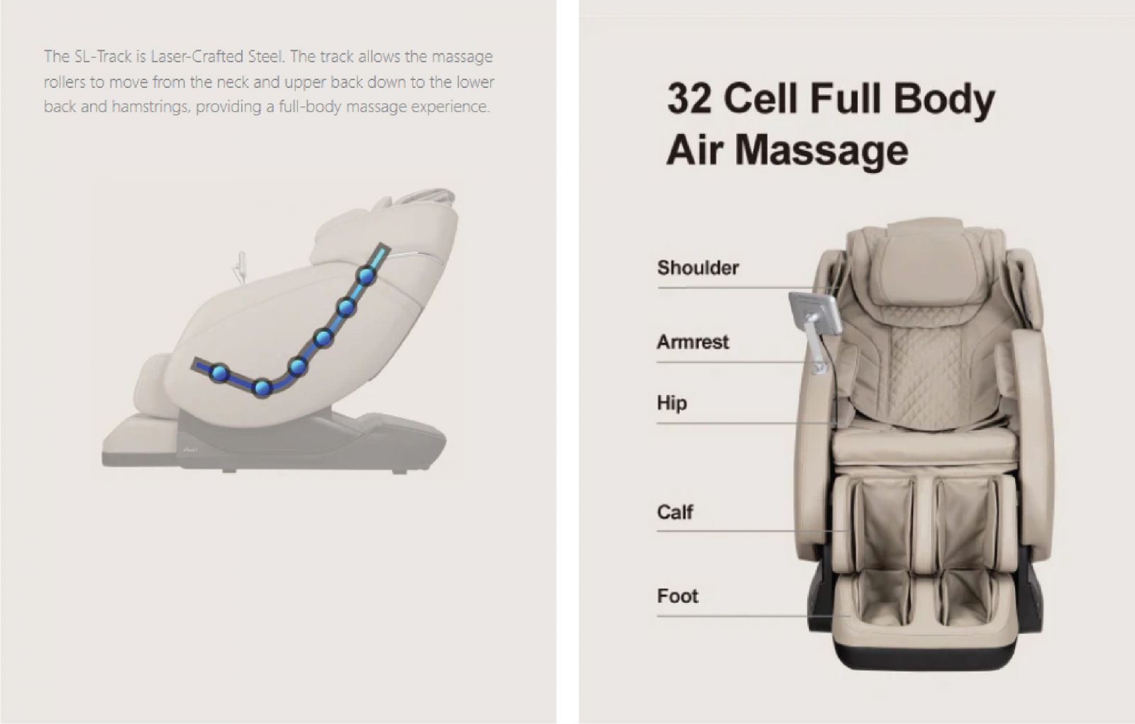 - 4D Massage Mechanism 10 Levels of 4D adjustment Made in Japan Computerized Body Scanning SL-Track 32 Air Cell Full Body Compression 3 Stage Zero Gravity Space Saving Technology Lumbar & Calf Heat Therapy 15 Auto Programs & 7 Massage Styles Calf & Foot Rollers Surround Sound Bluetooth Speakers Touch Screen Tablet