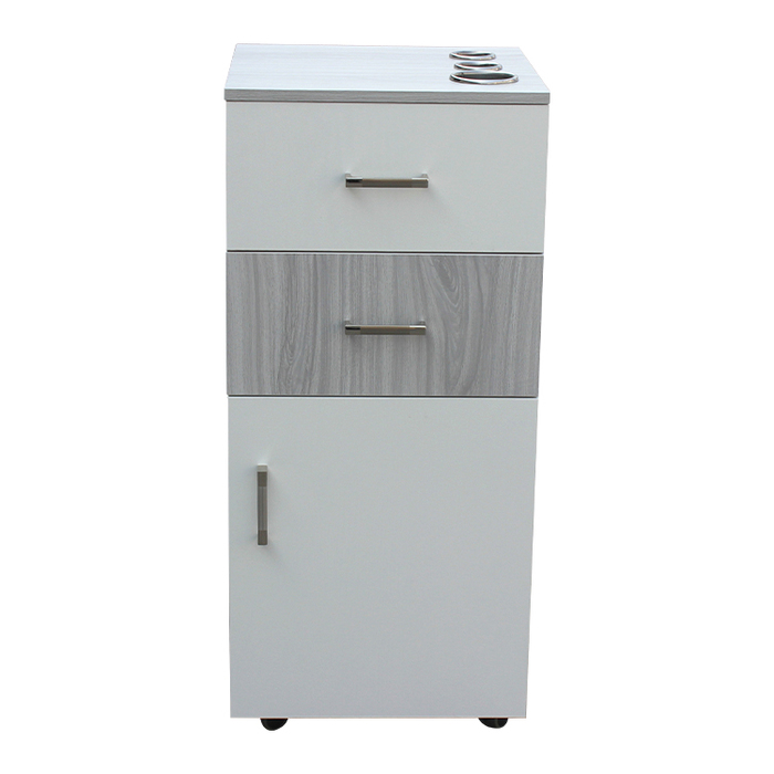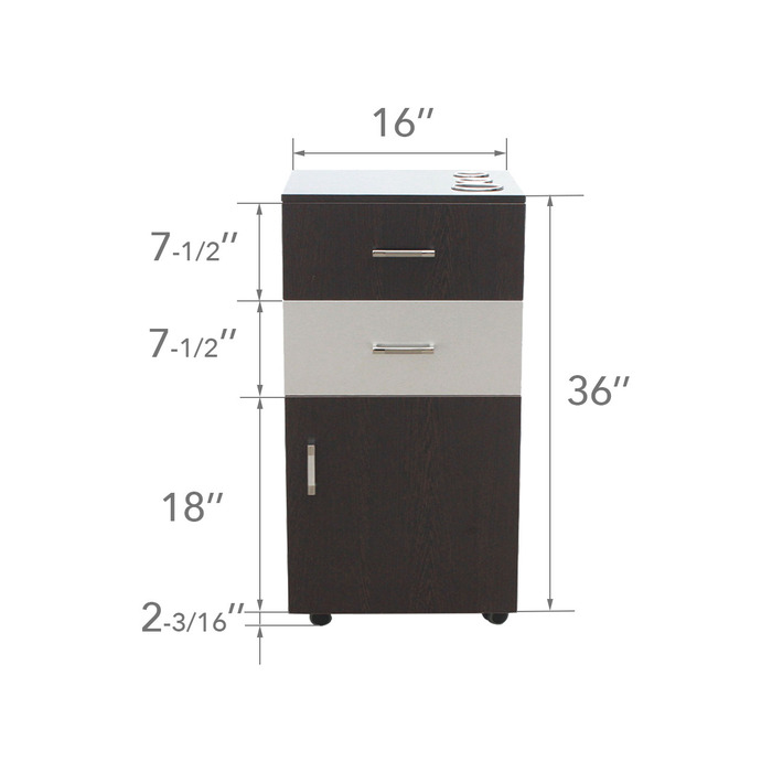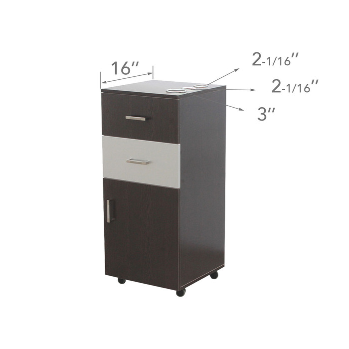 The "Bella" rolling styling station allows you to move your tools freely! No matter the profession this is a very handy cabinet to have in the home or office.  The station has 2 drawers, a small cabinet and 3 appliance / accessory holders. The available colors of black, brown, or white, with the middle drawer and top being brushed silver, will look great with any decor.