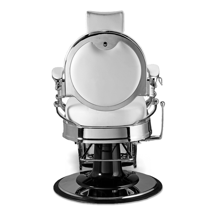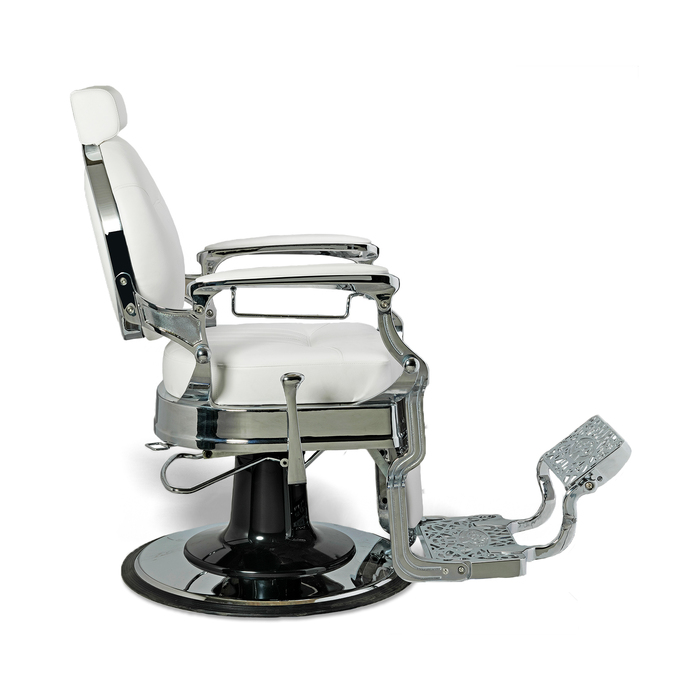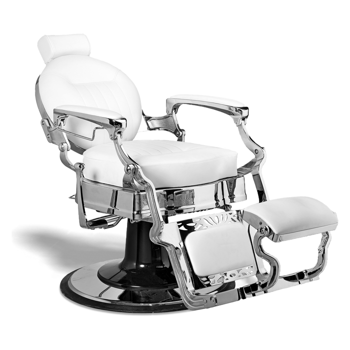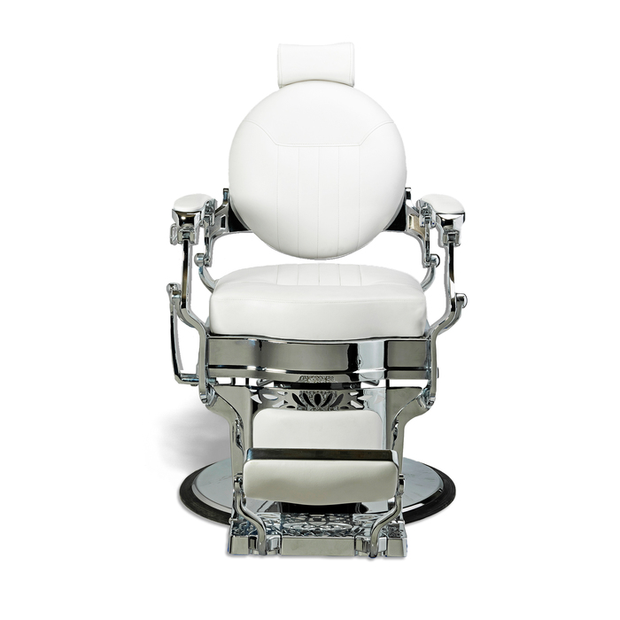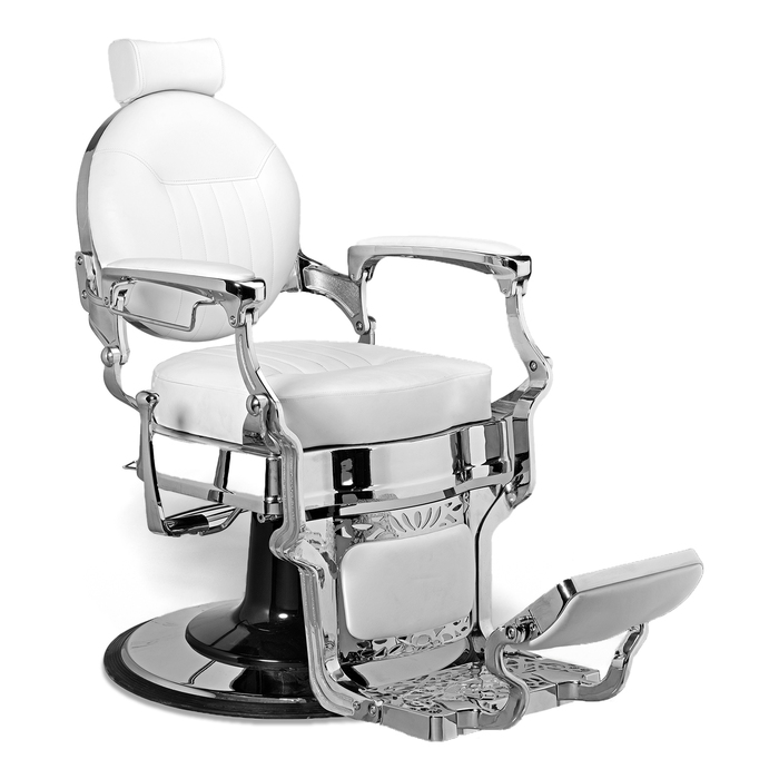 he Classy style of the McKINLEY Barber Chair will make your customers feel like a million bucks! The approximate 2 1/2" seat cushion, with polished chrome studs, sits atop a 3", scroll designed base and the "polished chrome veined finish" adds to the fascinating look of this chair. The chair has padded arm rests, towel bar, and lumbar support for your clients. The rise of the headrest to 11", will accommodate your tallest customers.