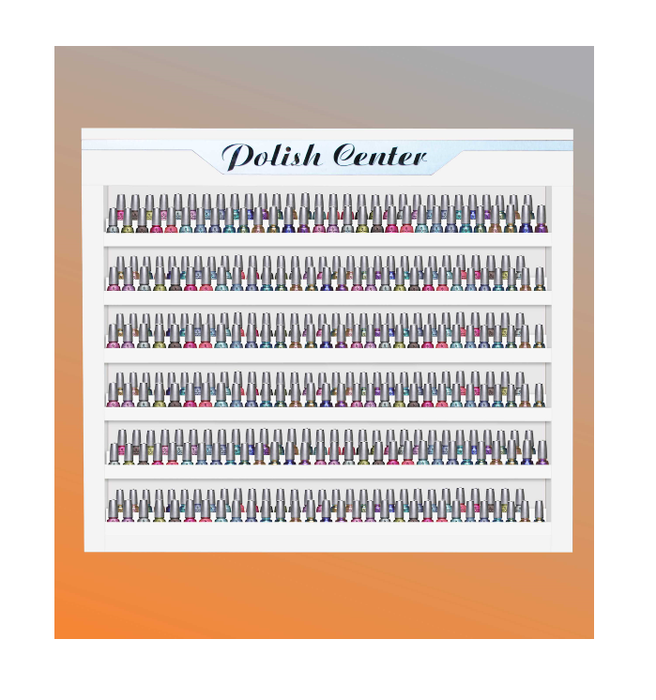 The \"Sonoma Double Polish Rack\" is the perfect wall hanging rack for your salon.  In white with silver accent, this shelf will showcase colors beautifully. The 6 double tiered shelves will allow you to display 360 nail polish colors.